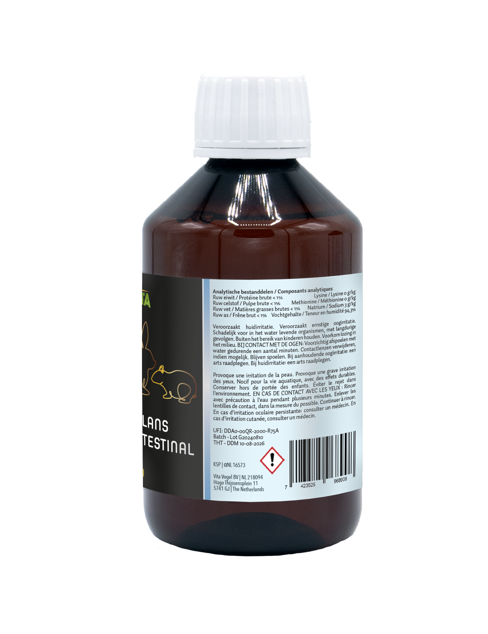 Invicta Intestinal Balance is a liquid acid based on a synergistic combination of buffered organic acids and the trace elements copper and zinc in chelate form. The product is successfully used for good intestinal function and to support protein digestion in the gastrointestinal tract of the rabbit or rodent. The lowered pH value in the gastrointestinal tract contributes to the inhibition of potential pathogenic bacteria, also in the drinking water.